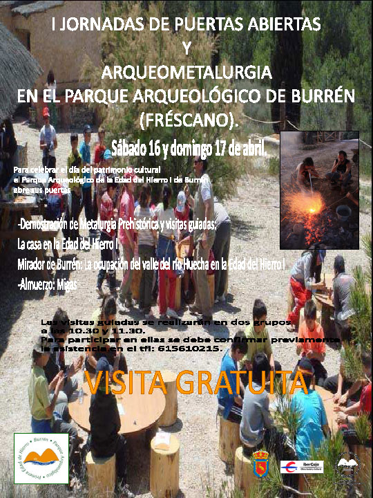El próximo dÃa 18 de abril se celebra el dÃa mundial del Patrimonio cultural, es por ello que el Parque Arqueológico de la Edad del Hierro I de Burrén (Fréscano) organizará unas jornadas de puertas abiertas y exhibicion de arqueometalurgia los dÃas: 16 y 17 de ABRIL. Durante las jornadas, los visitantes accederán a la recreación de la cabaña de la Edad del Hierro, al mirador de Burrén en el cual recibirán una explicación sobre el poblamiento del valle del Huecha durante el Bronce Final y la Edad del Hierro I, y asistirán a una experimentación de arqueometalurgÃa (fundición y moldeado de piezas de cobre) desarrollada por el grupo de arqueologÃa experimental "De la roca al metal". Los interesados en asistir deberán ponerse en contacto con los organizadores en el teléfono movil de contacto.